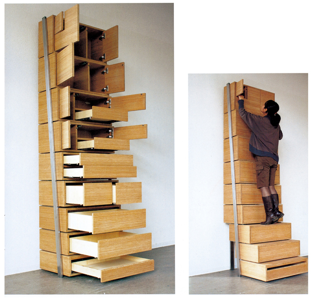 디자이너 대니 쿠오Danny Kuo는 디자인이란 수직으로 세우는 것이 가장 효율적이라고 믿는다. "미래 생활의 핵심은 높이에 있다."고 그는 말한다. 앞으로 잡아 당겨 뺄 수 있도록 되어 있는 계단식 책장으로, 팔을 뻗어도 닿지 않는 책을 꺼내는 일을 손쉽게 해결해준다. 그저 아랫부분의 책장을 밟고 올라서기만 하면 된다.