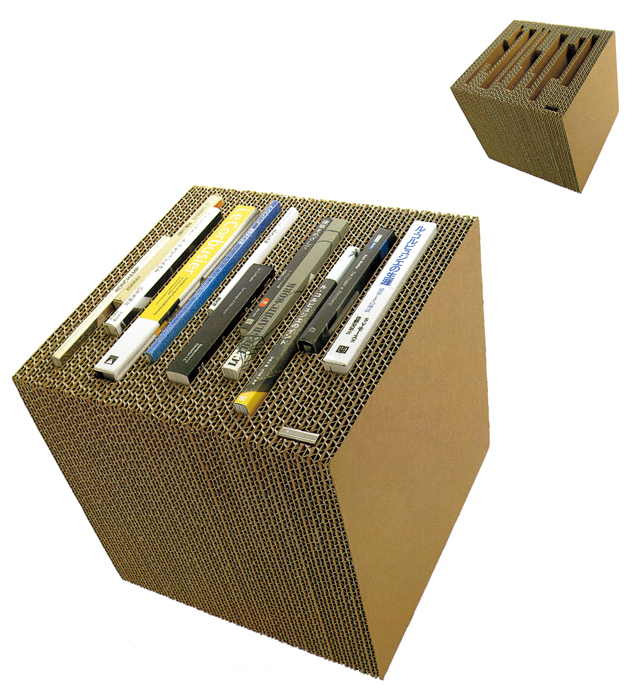디자이너 오키 사토Oki Sato는 서점 매니저인 하바 요시타카Haba Yoshitaka가 고른 책의 크기에 딱 맞추어 판지를 자르고, 조립하고, 접착해 책장을 완성했다. 오른쪽 하단에 브랜드 이름이 적힌 작은 금속판 뒤에는 책장에 꽂힌 책에 관한 정보가 담긴 작은 팸플릿이 들어 있다.
